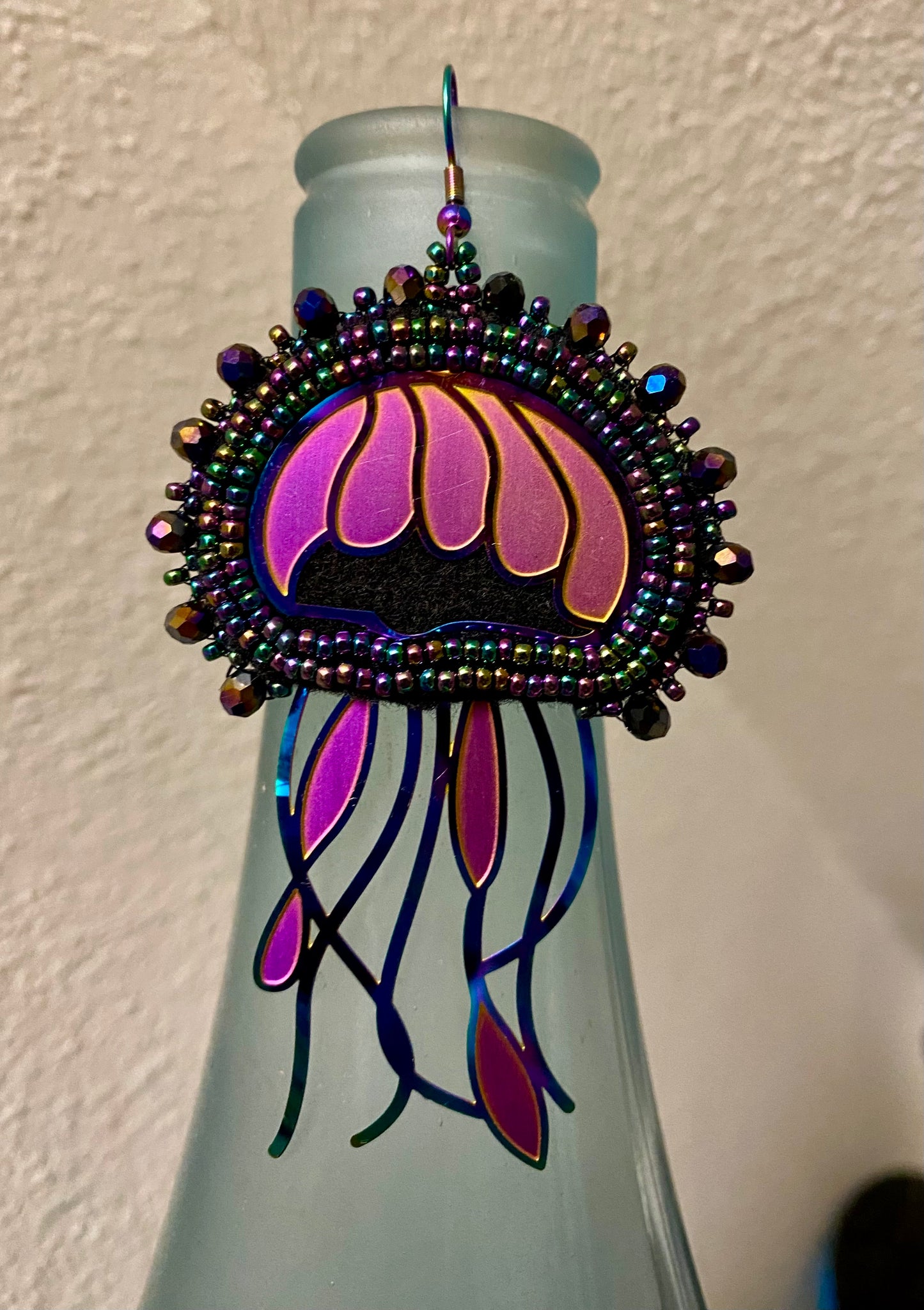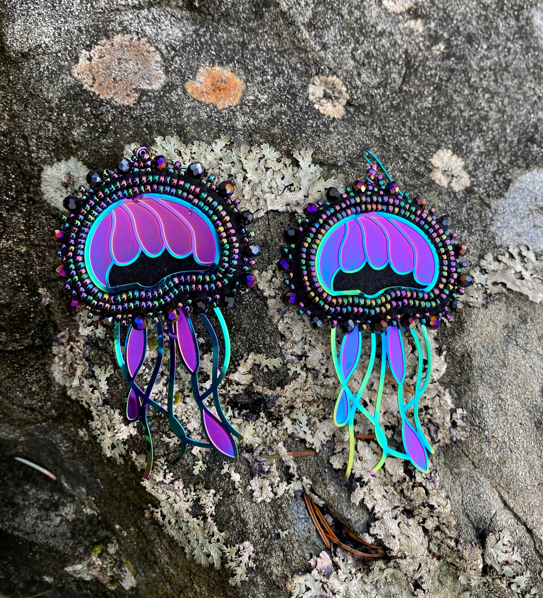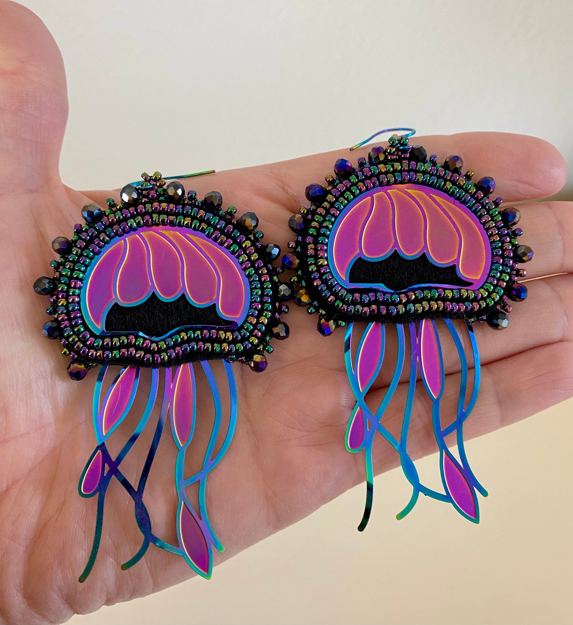 Iridescent metallic Jellyfish centers surrounded by gasoline sheen metallic beadwork. Matching black-metallic iridescent 4mm rondelle edging. On black felt with black backing and matching earring findings. They have 1.5 inch metal tentacles!